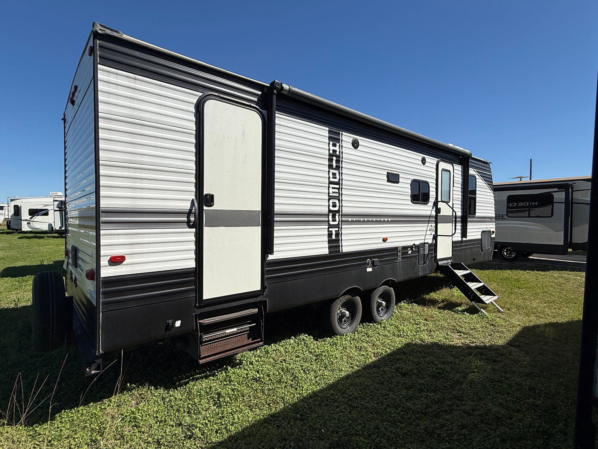 The Keystone Hideout 272BH is a great family bunkhouse floorplan. This camper has a spacious layout with double-over-double rear bunks, a large slide-out in the living area, and a private front queen bedroom, making it perfect for family camping trips.