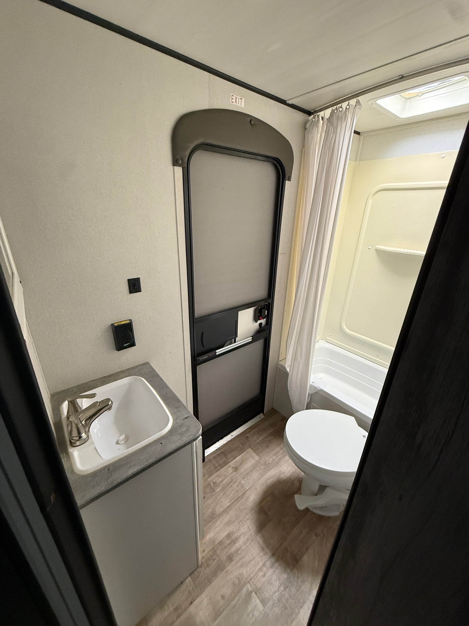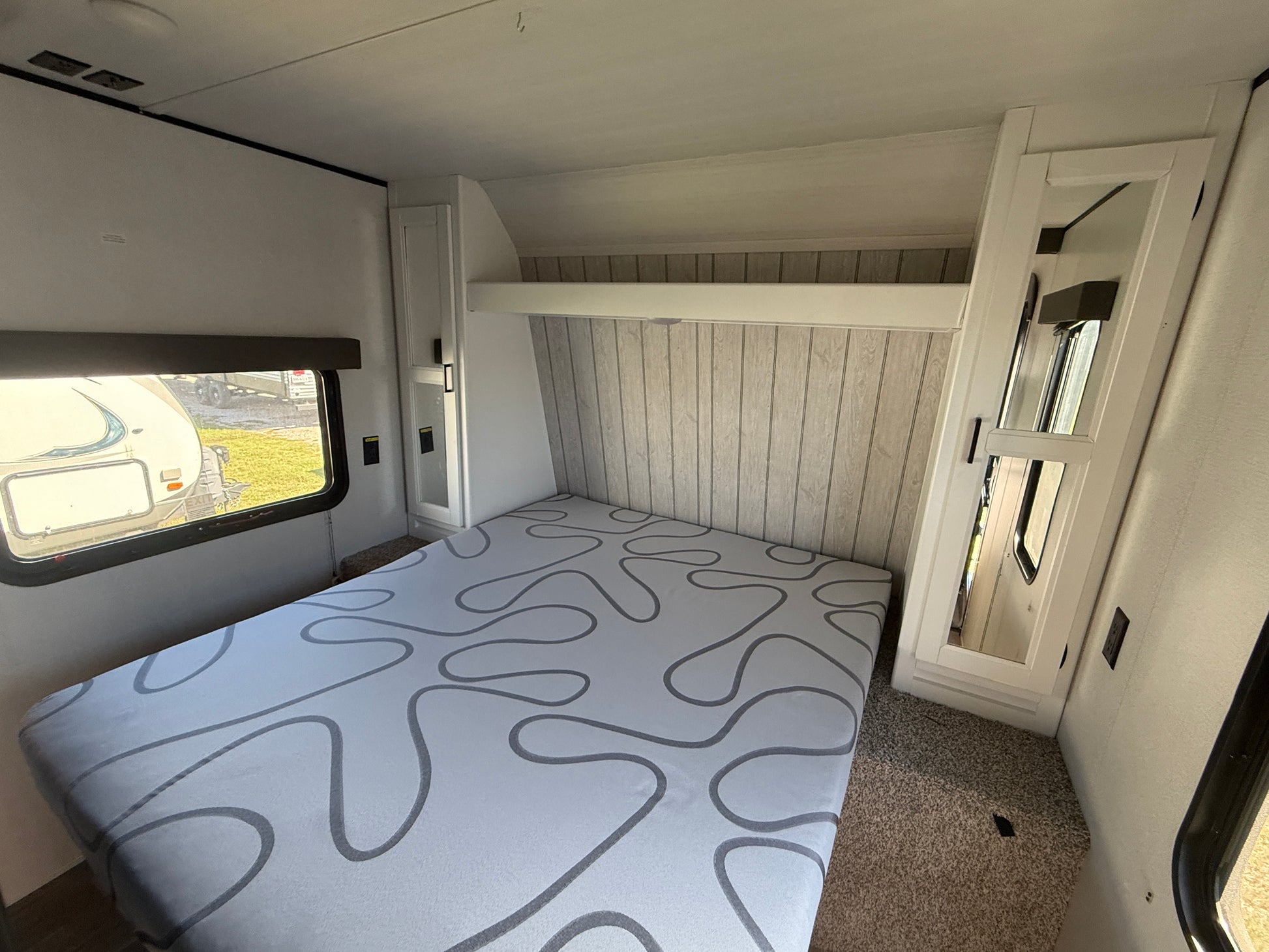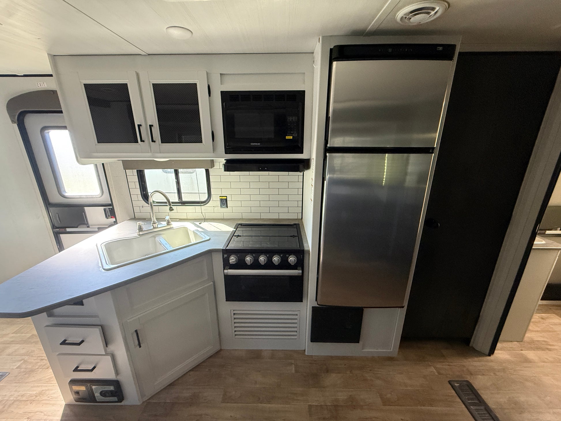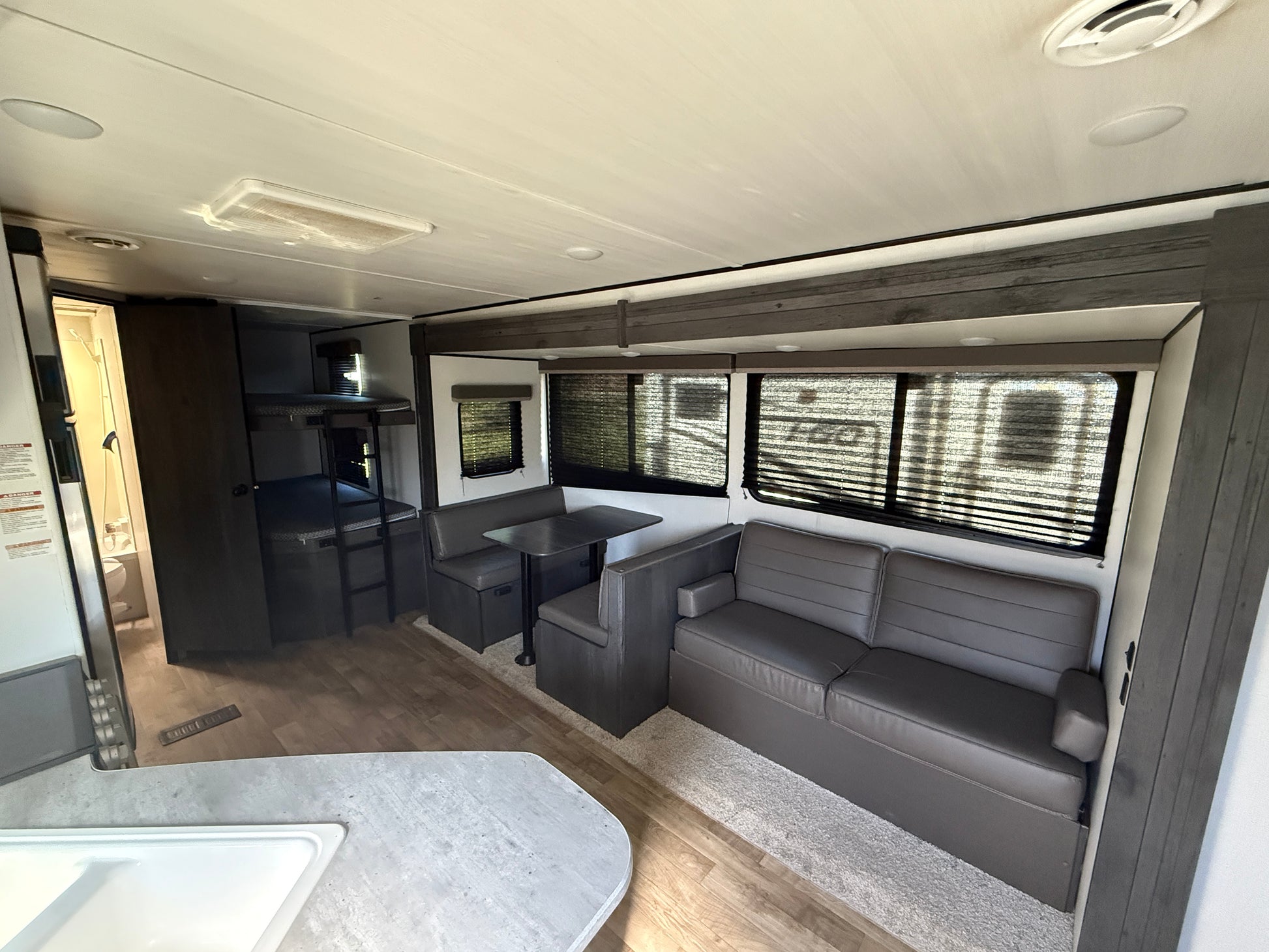 The slide-out opens up the living and kitchen area and includes a sofa and booth dinette, giving you plenty of room to relax or entertain. The kitchen comes fully equipped with a 3-burner stove, oven, microwave, and large refrigerator along with plenty of cabinet space.